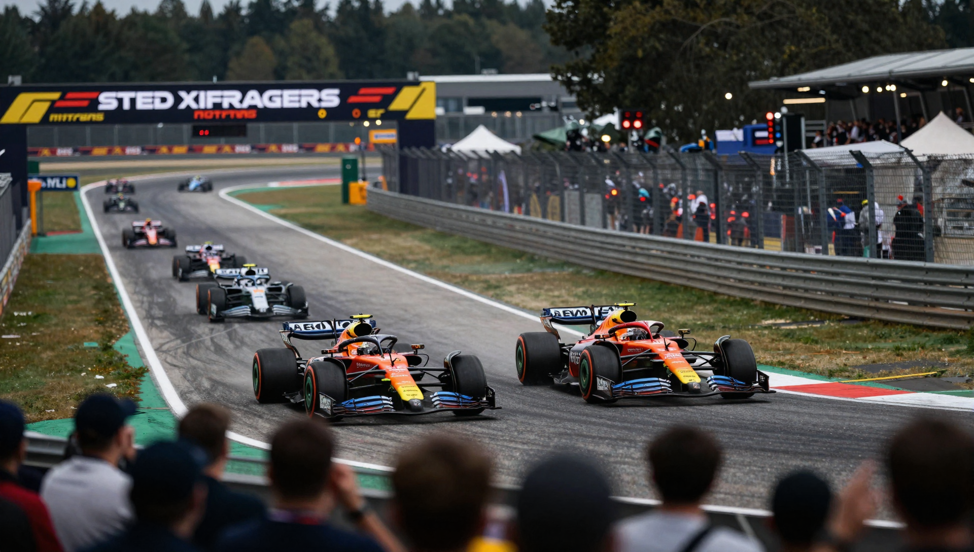 F1比赛场,观众视角,专业车手驾驶赛车在赛道上你追我赶,现场的观众也将比赛氛围推向了赛点高潮。