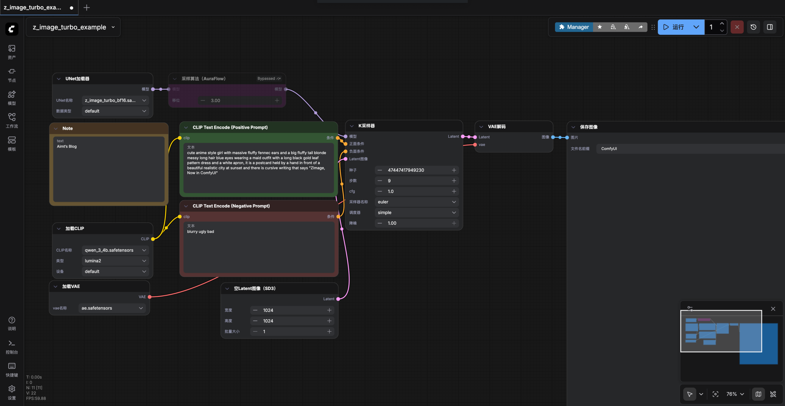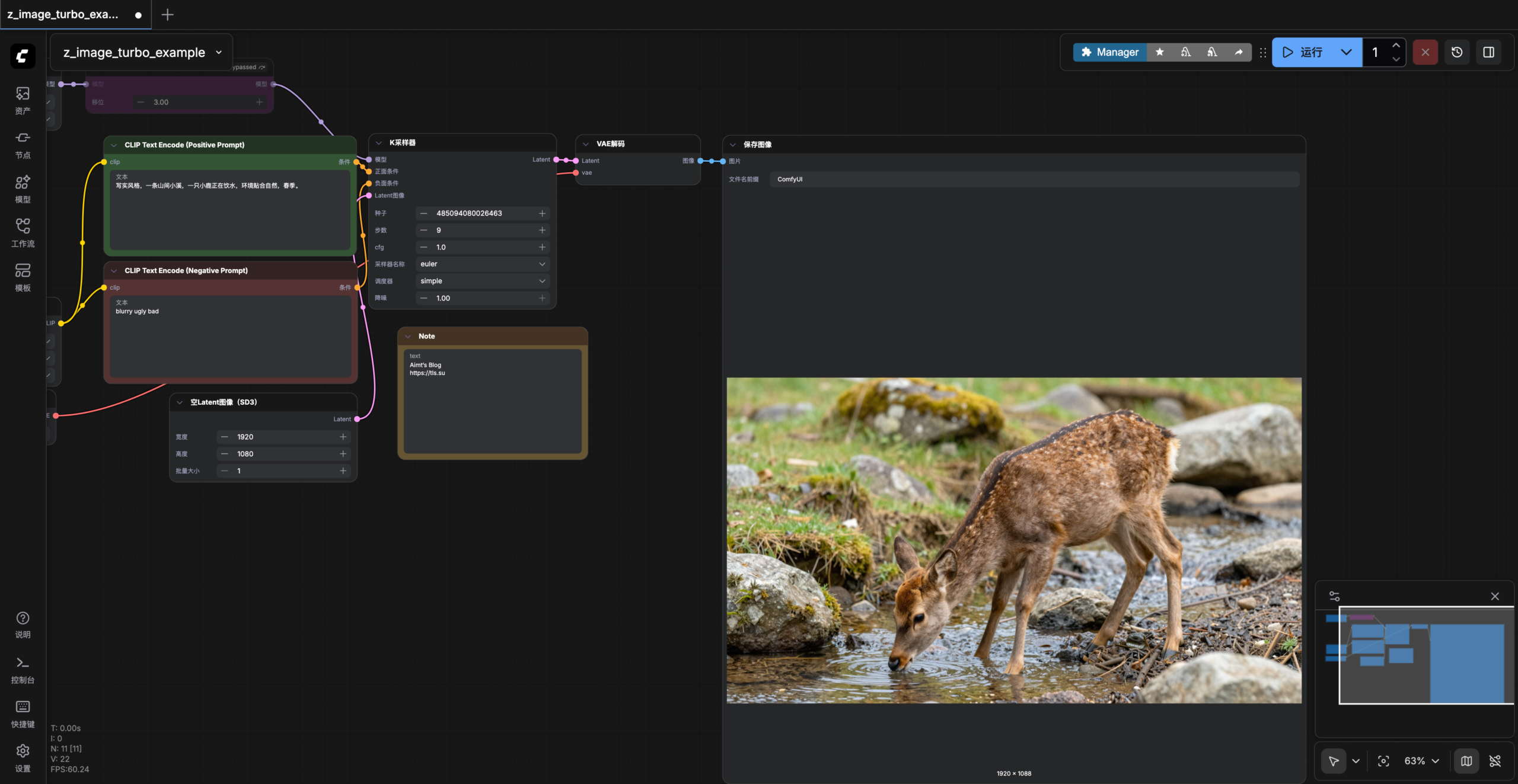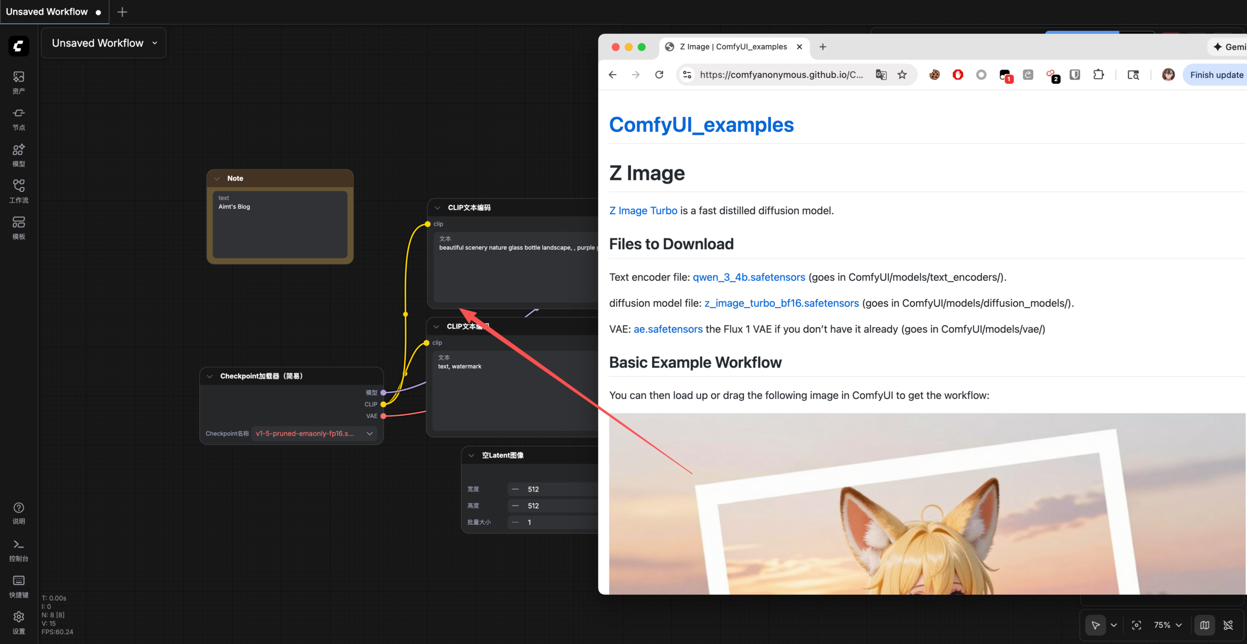 接着我们将由 https://comfyanonymous.github.io/ComfyUI_examples/z_image/ 提供的 Z Image 工作流示例图片直接拖动到我们ComfyUI中。