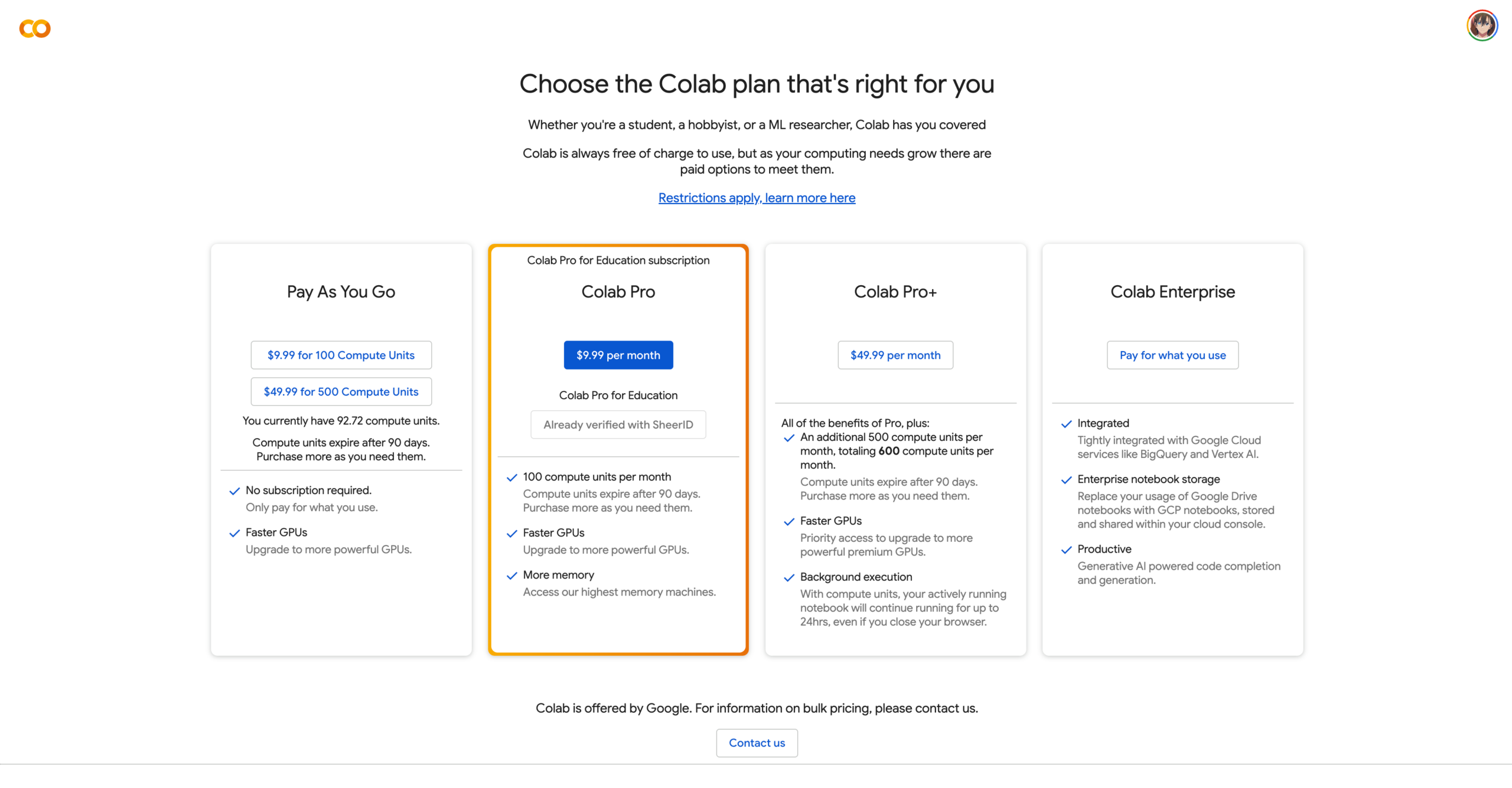 Pro套餐每月包含100点算力也足够我日常轻度使用了,订阅费用为$9.9/mo,当然也可以使用US教育邮箱做学术认证方可使用,我这里采用了后者订阅方式,大家可以根据自身所需选择合适的套餐订阅使用。