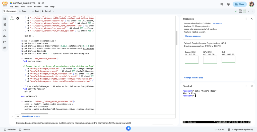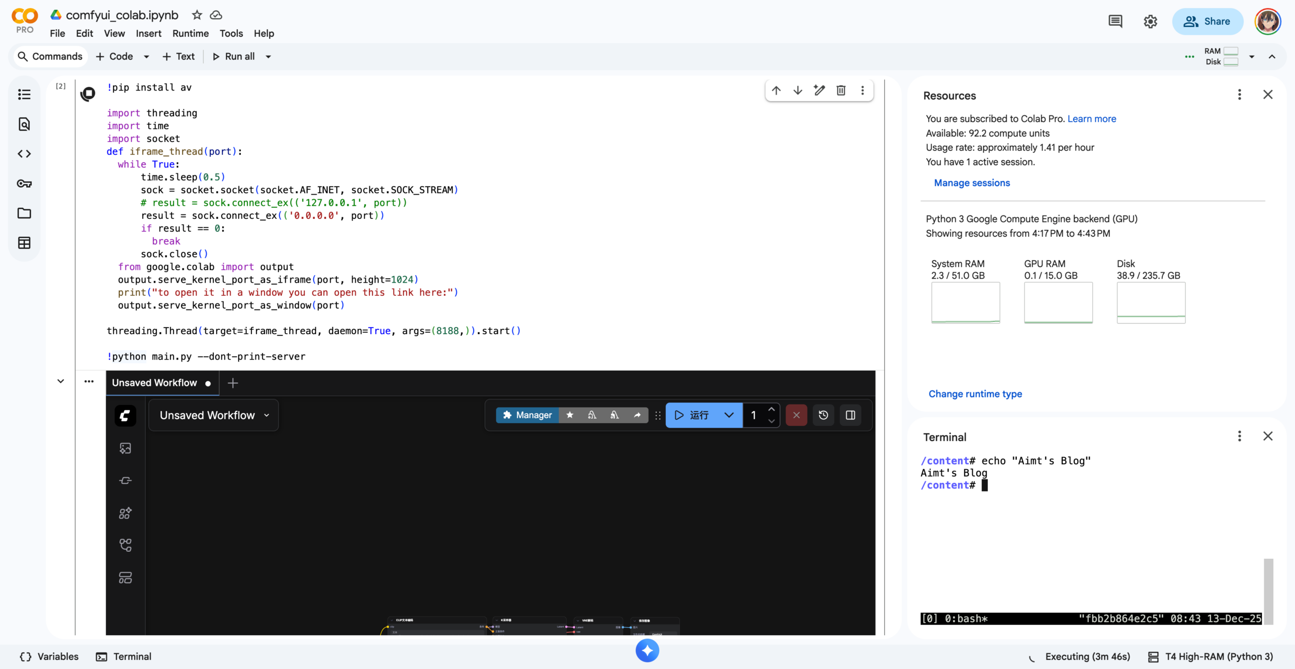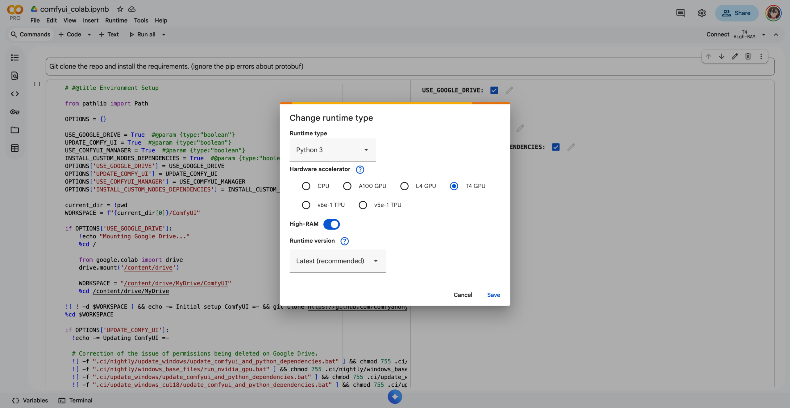 开通后访问 https://colab.research.google.com/ 就可以开始使用了,引入来自 ComfyUI-Manager 官方项目中的 .ipynb 文件到Colab Workspace,右上角选择对应算力运行类型,里面主要是环境和GPU选择,经济考虑,我这里选择了T4 GPU搭配High-RAM(51GB),内存一定要选择上Hight-RAM,就拿一个有 70 亿参数的模型,如果用 FP16,光权重就要占有大约 14GB 内存,更别说还有推理过程的占用了。